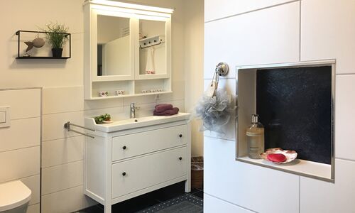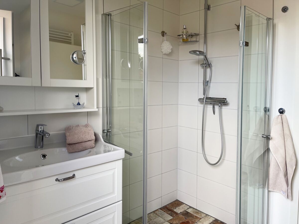 - Bad 2: Fenster Richtung Norden, Milchglastür mit Fenster zum Lüften, ebenerdige Dusche, Fliegengitter